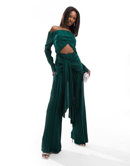 Mono largo verde botella plisado de pernera ancha con escote Bardot y detalle anudado en la parte delantera de ASOS DESIGN Very well made.